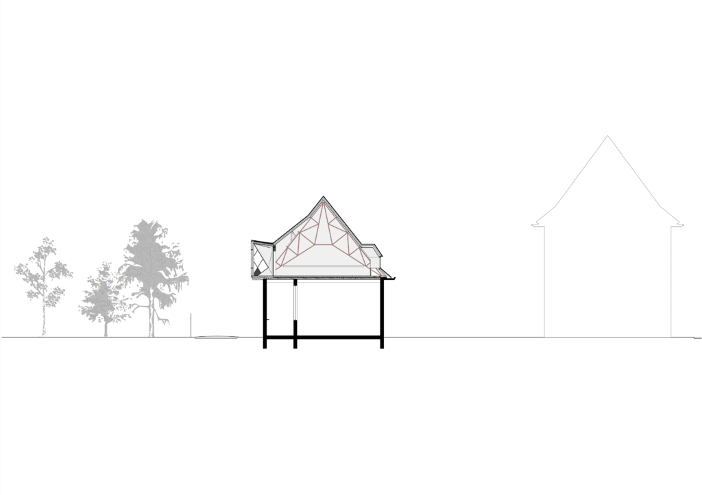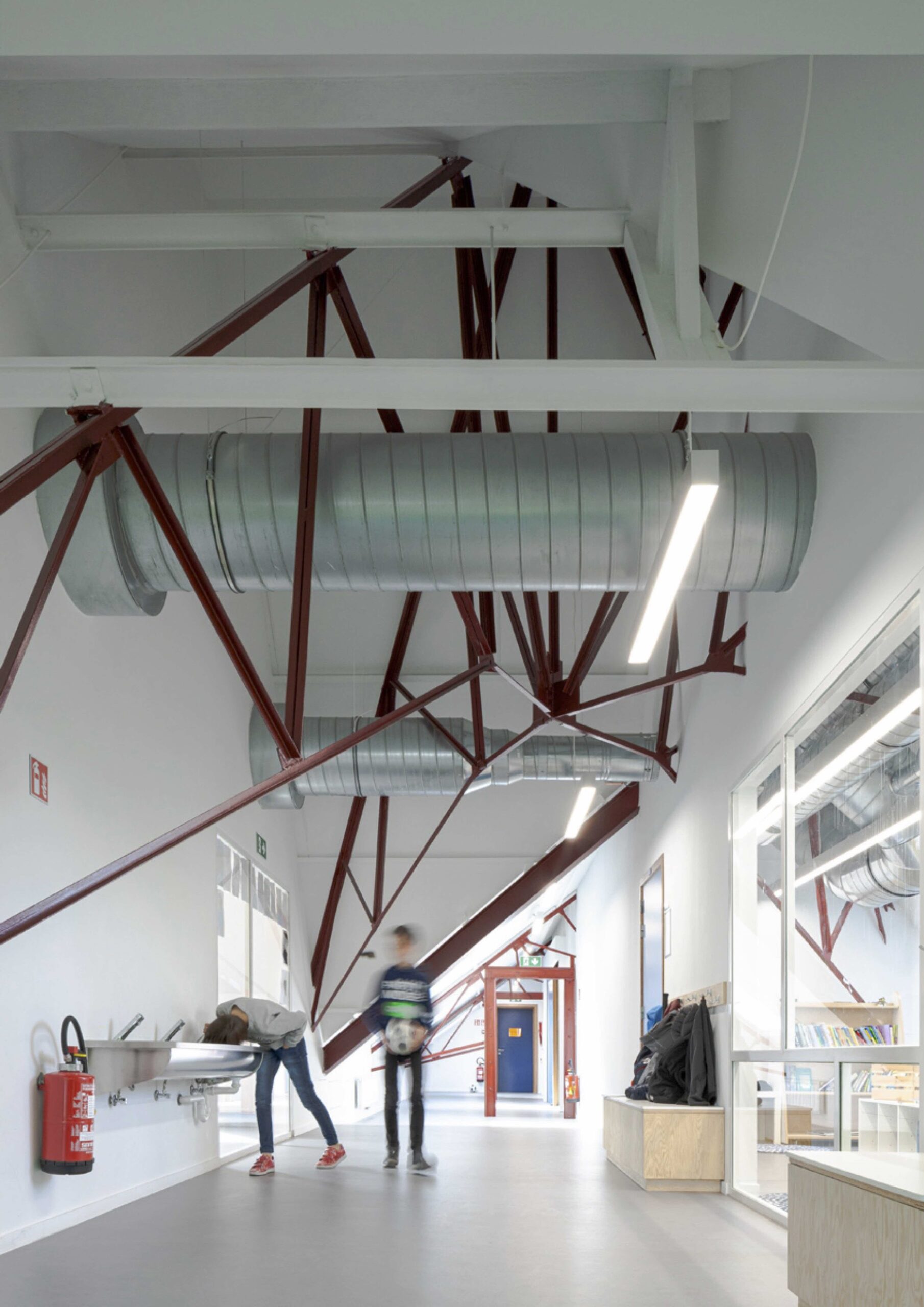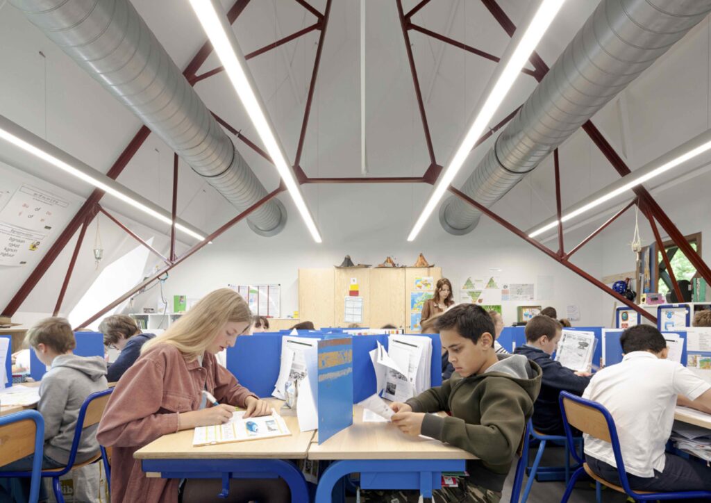 De school Mooi Bos wilde extra klassen op zolder en daarvoor moesten de unieke ranke stalen spanten doorgeknipt worden. PLUSOFFICE kwam ter hulp en stelde een buitengang voor die zich uit de dakstructuur ontpopt en meteen ook de stabiliteit van de vloerplaat oplost. De nieuwe klassen worden zo groter en makkelijker bereikbaar. Extra klassen en een karakteristieke speelgang? Dat zag de basisschool Mooi Bos helemaal zitten. De nieuwe gang is een lange dakkapel met een sterke en lichte ruitvormige structuur die het noorderlicht via binnenramen tot diep in de klassen trekt.
