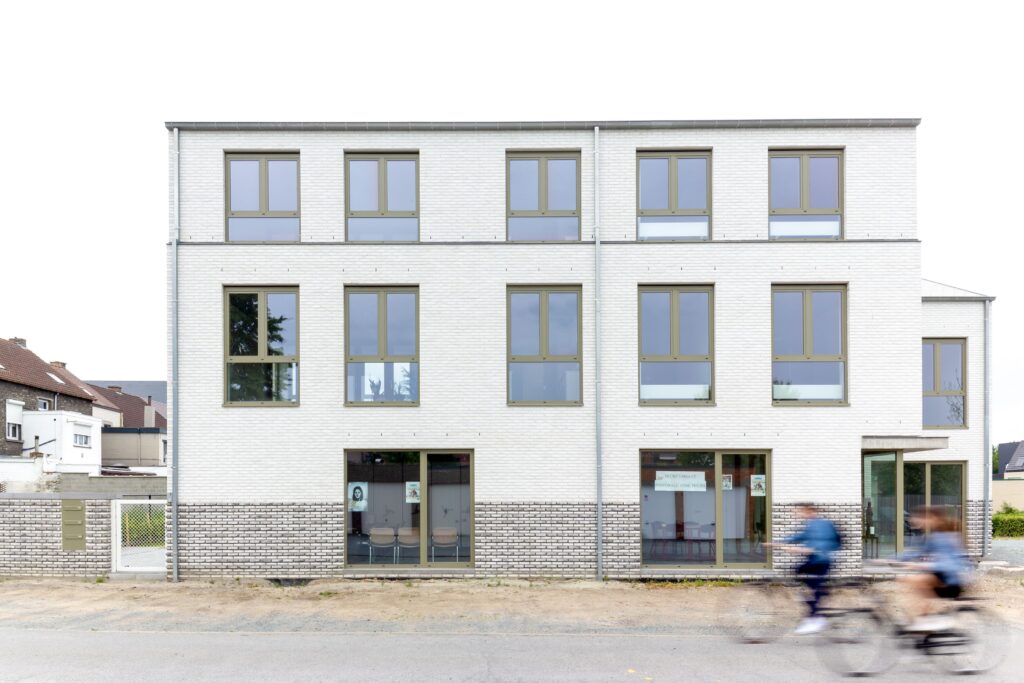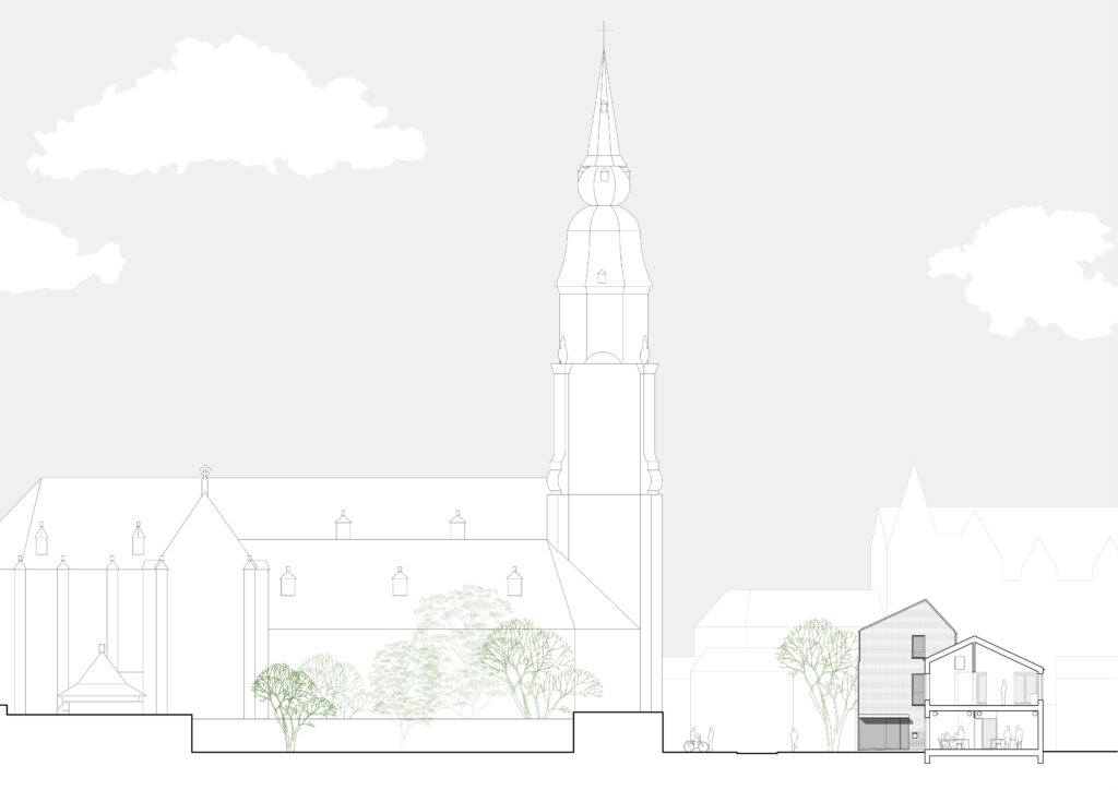 Twee in elkaar geschoven zadeldaken geven het volume de korrelgrootte van de omliggende bebouwing. De voorgevel met zijn baksteenplint, luifel voor het parochiesceretariaat en lichtjes achteruitgeschoven tweede verdieping passen in een zoektocht naar een gelede gevel. De appartementen richten hun leefruimtes en inpandige terrassen op de tuin die zowel voorkant als achterkant is.