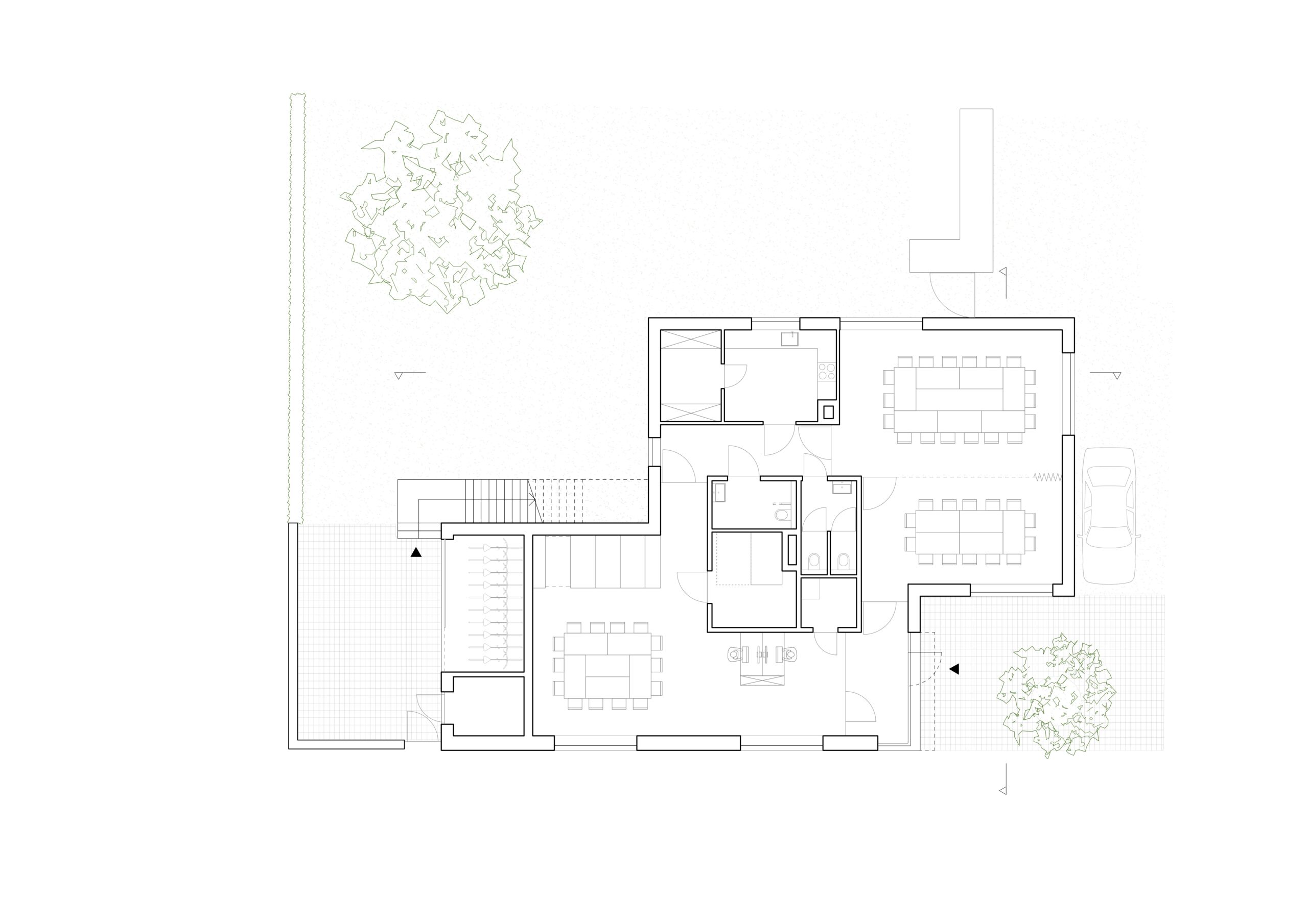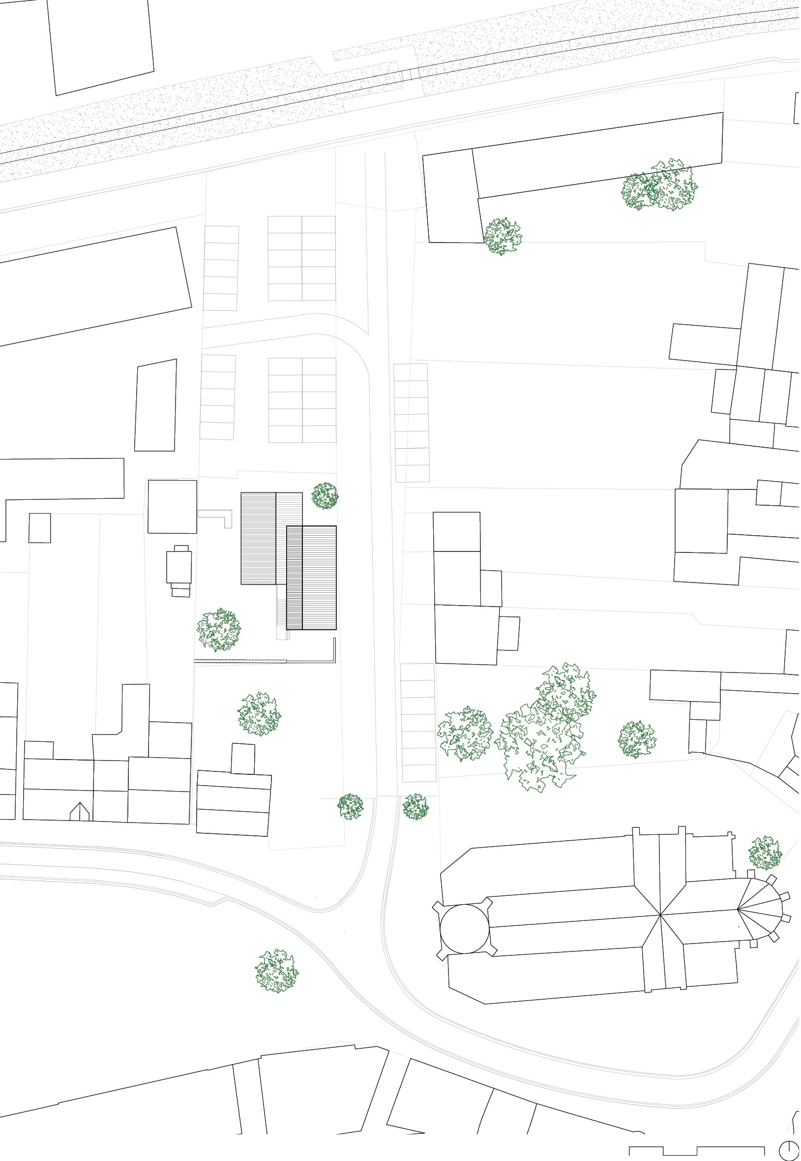 Met een precieze inplanting van het volume wordt een nieuwe bouwlijn vastgelegd voor de toekomstige bebouwing en omgevingsaanleg. Het project is een pionier in de dorpskernverdichting, niet alleen als voorloper van toekomstige inbreidingen achter het kerkplein, maar ook als alternatief voor een dorpse verdichting, op schaal van en genereus voor het dorp.