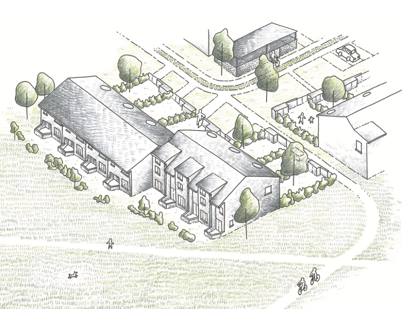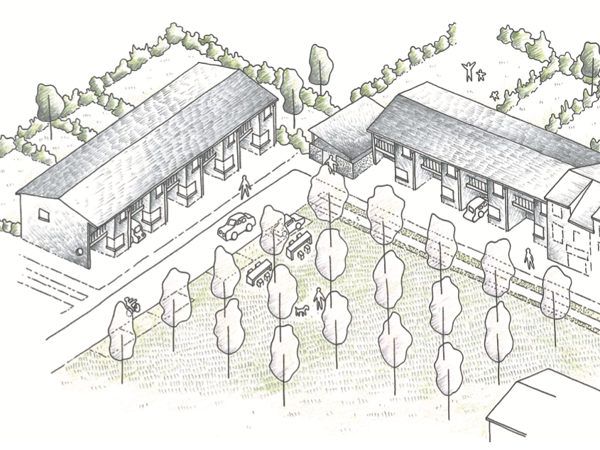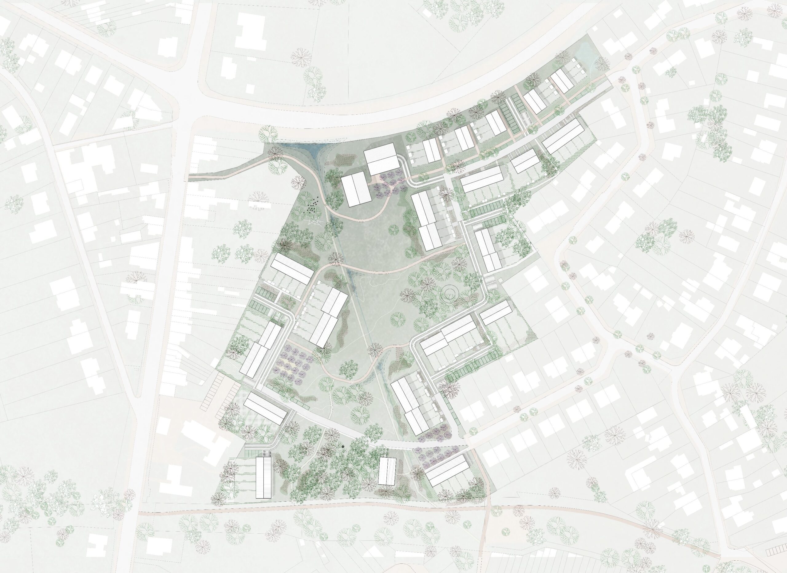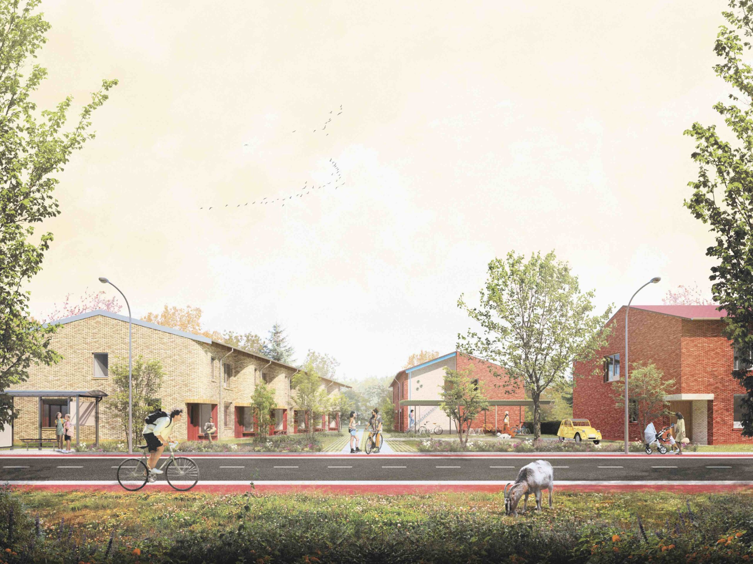 Het clusteren van de woningen in groepjes van 3-5-7 laat ons toe om de ruimte voor dit groen te maximaliseren en geeft de buurt een schaal op mensenmaat. De inplanting van de woonvolumes definieert verschillende soorten van buitenruimtes waar sociale interacties worden uitgelokt en het buurtgevoel op vele manieren vorm kan krijgen: een buurtstraat, een bloesemerf, een (speel)bosje etc. Bestaande ongedefinieerde randen worden ‘afgewerkt’ en er ontstaan geleidelijke overgangen tussen de naastgelegen verkaveling en de Siegelstuin. De publieke ruimte is doorwaadbaar en het routenetwerk krijgt een duidelijke stapsgewijze hiërarchie waar veiligheid, functionaliteit en permeabiliteit primeren. Van buurtstraat over karrespoor tot wandelpadje in de oude holle wegel. Bezoekers parkeren in de buurtstraat bij het toenaderen van de wooncluster. Bewoners rijden net iets verder over het karrespoor om hun fiets of wagen vervolgens op het parkeererf of op eigen terrein te stallen. De woonvolumes zijn eenvoudig, karaktervol en herkenbaar. De volumetaal voelt vertrouwd en degelijk aan en draagt bij aan het dorpsstedelijke en het rijke sociale karakter van de woonbuurt: licht hellende daken voor alle volumes, kleine knikken en uitsprongen in gevels en daken breken het perspectief en intrigeren. De basiselementen van het wonen worden op een zichtbare manier vormgegeven (beschut binnen komen, achterom kunnen lopen) en bieden plaats voor ontmoeting en subtiele overgangen tussen privé en publiek. Het streekeigen en natuurlijk materiaalgebruik biedt een divers maar herkenbaar en sober pallet waarbinnen variatie mogelijk is. Elk woonvolume kan uniek worden, binnen één beheerst materialenpallet. We onderscheiden drie woonhabitats: wonen langs de buurtstraat, wonen aan de Siegelstuin en wonen rond een bloesemerf.