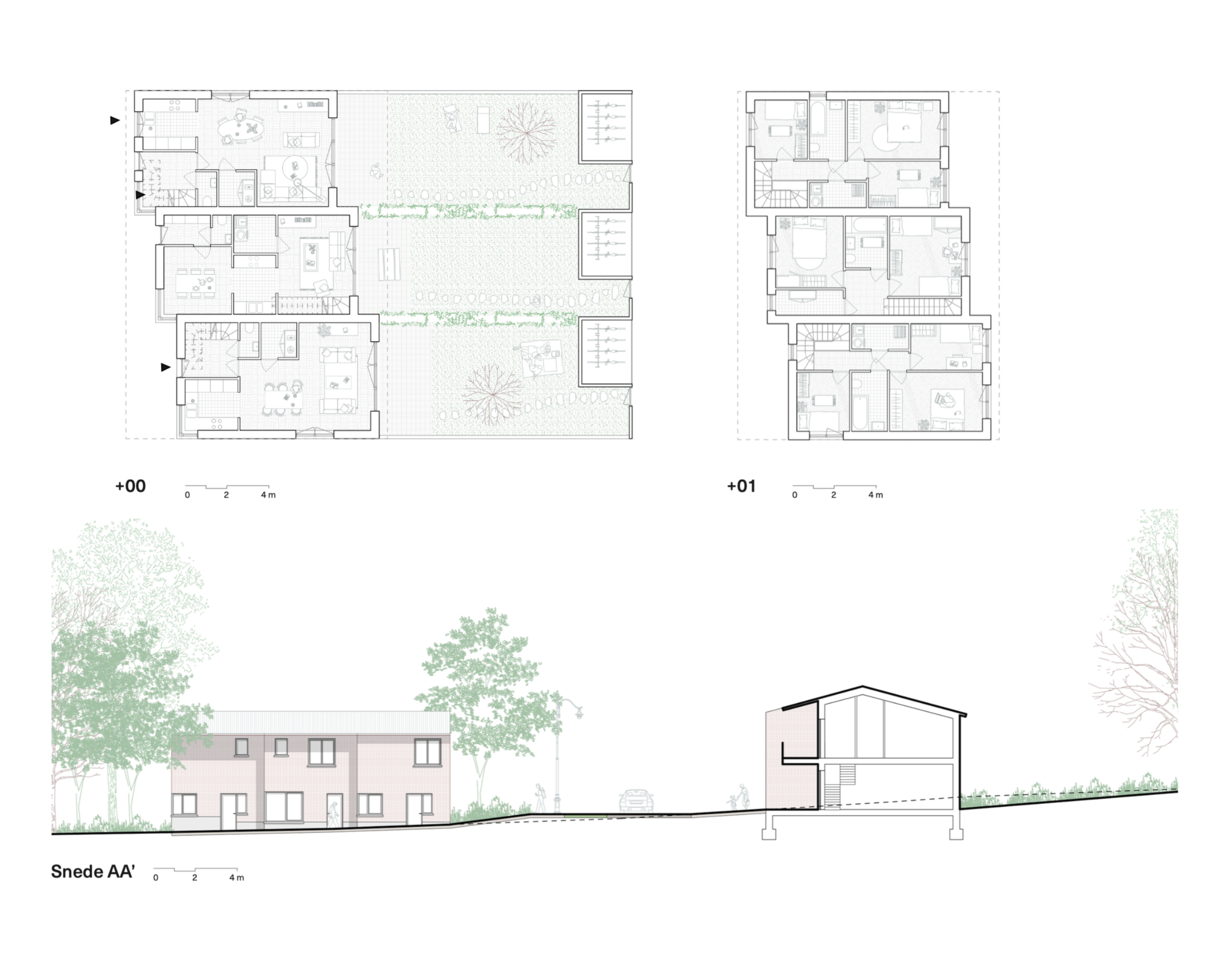 Aan de bloesemerfjes -elk met hun eigen boomsoort en identiteit- krijgen de Atelierwoningen, de Carportwoningen en appartementen met privaat parkeren hun plaats. Deze genieten van meer traditionele private achtertuinen en terrassen, terwijl aan de voorzijde hun relatie tot het bloesemerf op een vernieuwende wordt vormgegeven. Sociale interactie wordt uitgelokt maar niet op een dwingende manier.