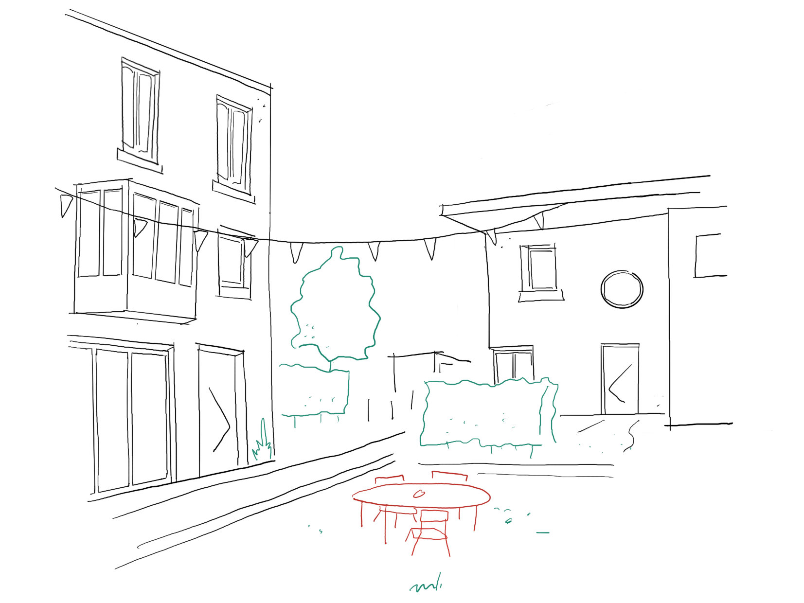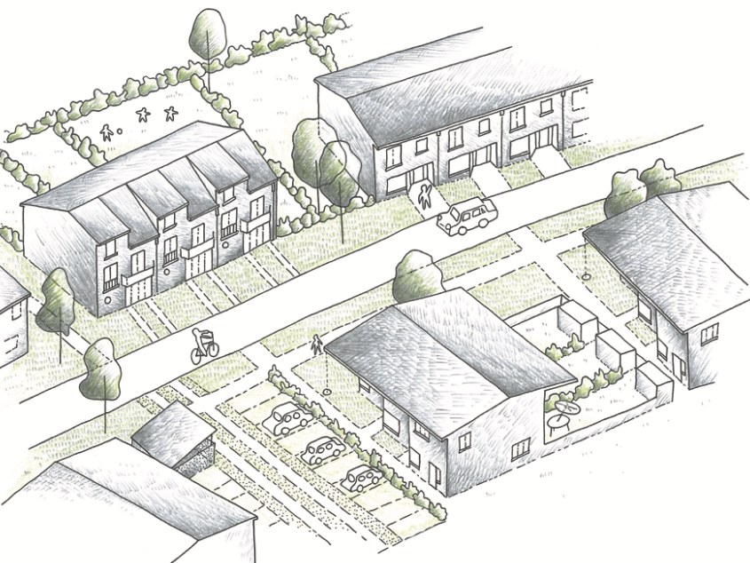 Het “wonen langs de buurtstraat” begeleidt de geleidelijke overgang van de bestaande “prototype-verkaveling” zoals we ze kennen, naar het vernieuwende woonlandschap van de Siegelstuin. Meer traditionele woningen met private parkeergelegenheid wisselen af met Driewoonsten die zich dwars tussen de Molenweg en de nieuwe buurtstraat nestelen. De 3 woningen zijn telkens via kleinschalige erfjes toegankelijk en hun tuinen vergroenen het straatbeeld. “Wonen aan de Siegelstuin” omvat de Tuinwoningen en Erkerwoningen die letterlijk met hun voeten in de Siegelstuin staan. Hun leefruimtes en terrassen kijken erover uit. De private tuinen bevinden zich aan de andere zijde en vormen de handige en groene overgang tussen parkeererf en woning.