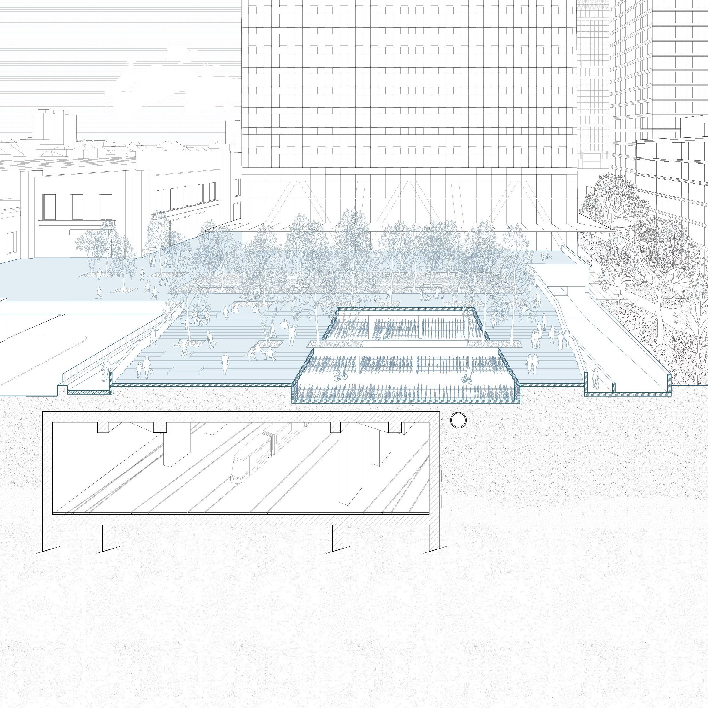 Binnen het complexe kluwen van visies, vergunningstrajecten voor vastgoedprojecten en infrastructuuruitdagingen werd door ontwerpend onderzoek een gemeenschappelijke visie uitgezet. Diverse belangen van pendelaars, fietsers, buurtbewoners, de bodem, het water dat permanent uit de metrotunnels wordt gepompt, de operationele diensten van de NMBS, enz. werden met elkaar gekruist in cocreatie workshops. Dat leidde tot een overzichtelijk plan voor de publieke ruimte met drie deelthema’s: klimaatbestendige inrichting, optimaliseren van intermodale stromen en inclusieve publieke ruimte.