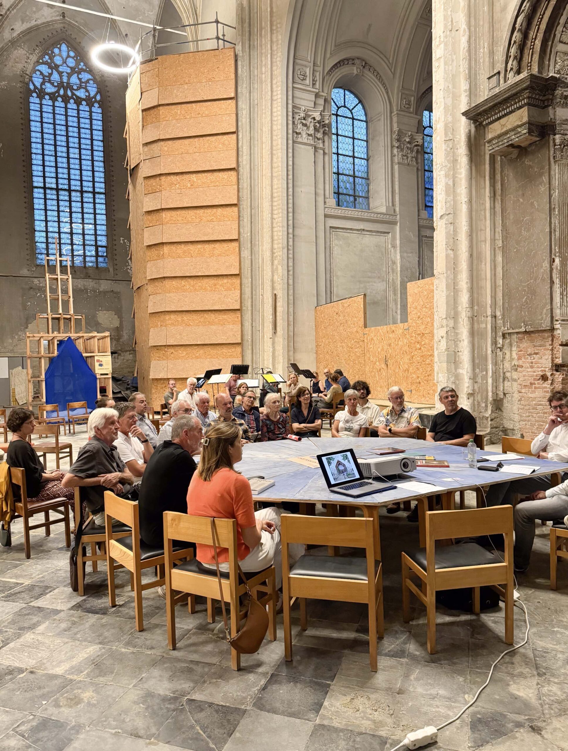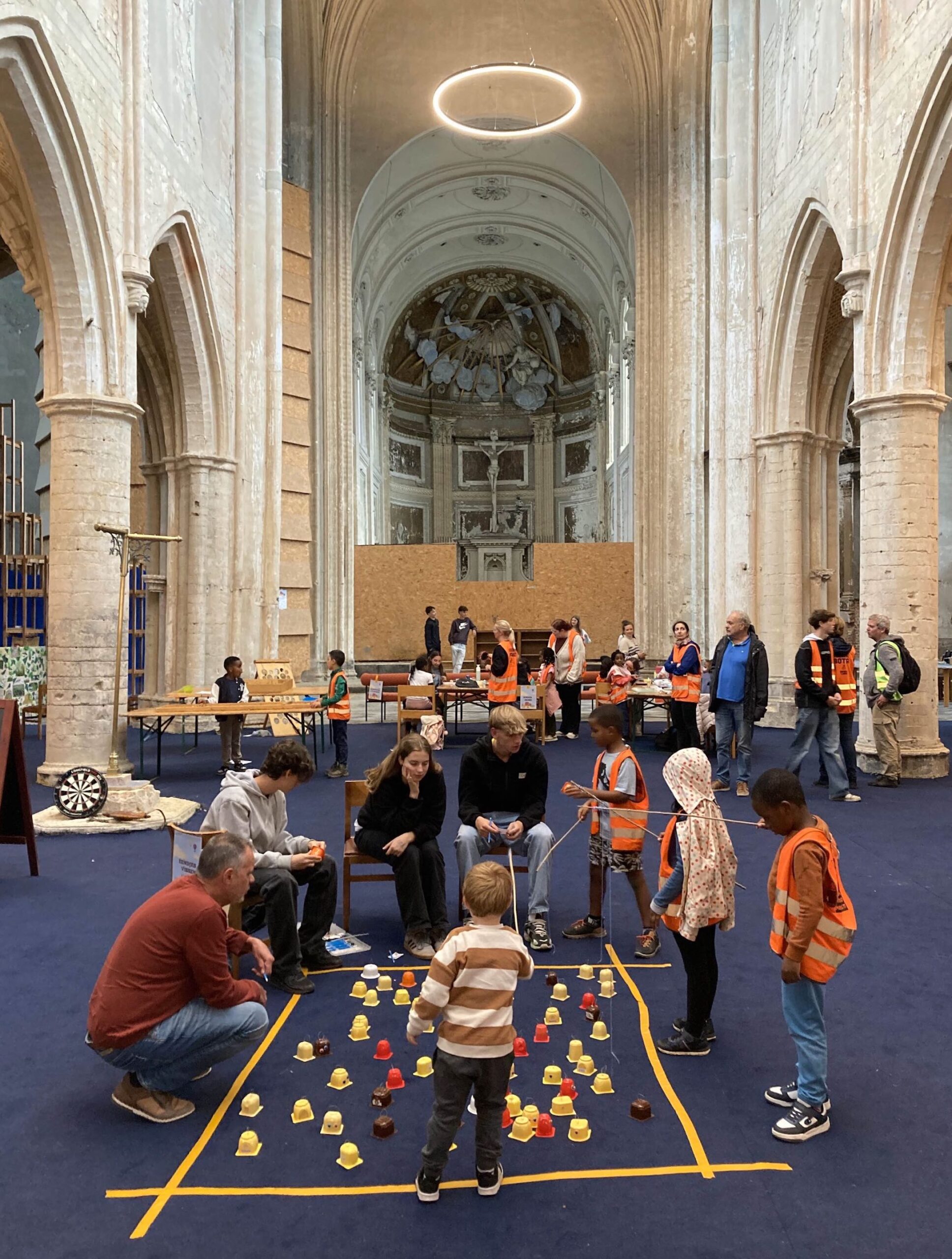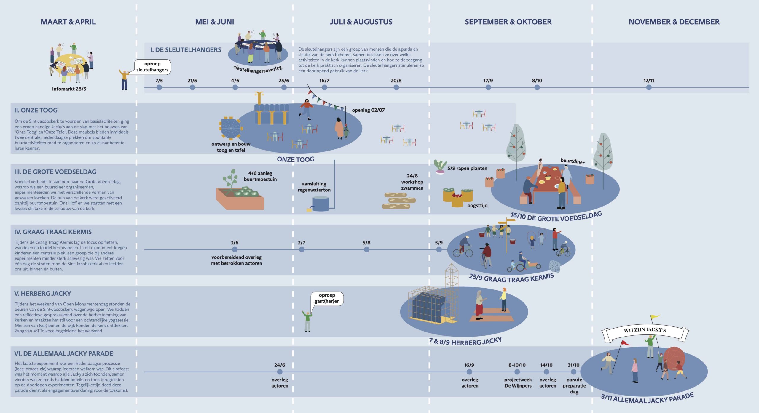 Een intensief co- creatietraject – waarin het samen denken, doen en doen-denken centraal staan – tracht deze bijzondere plek te transformeren tot een verbindend wijkhart: een ontmoetingsplek voor én door de buurtbewoners, -verenigingen en stakeholders (onder meer kerkfabriek en naburige scholen). Na een grondige ruimtelijke analyse van de omgeving en erg uitgebreid stakeholderonderzoek, testten we onder het motto ‘Allemaal Jacky’s’ met zes uiteenlopende experimenten hoe de buurt mede-eigenaarschap kan opnemen bij het invulling geven aan deze reeds ontwijdde kerk.