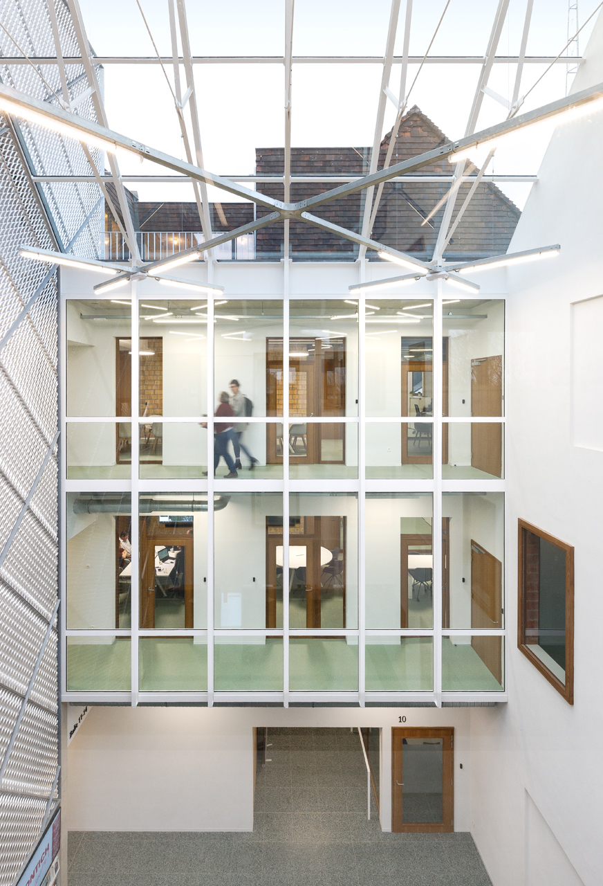 Nieuw administratief centrum, Kontich Een nieuw atrium fungeert als centrale hub met zicht op gedeelde vergaderruimtes: genereus in ruimte, eenvoudig in gebruik.