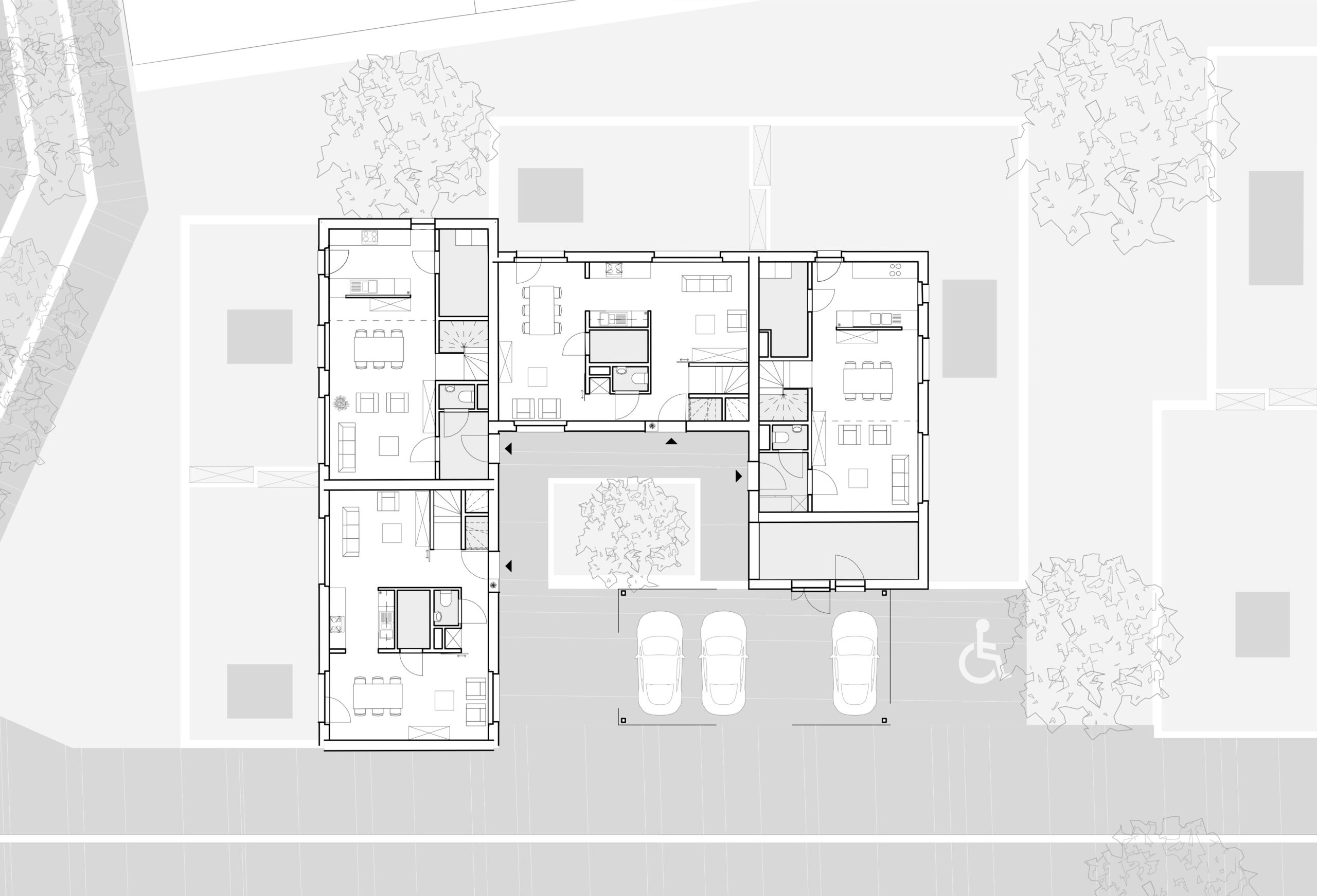 Mechelbaan, vervangingsbouw met 34 sociale woningen Verdichten door te delen: de tuin als collectieve plek.