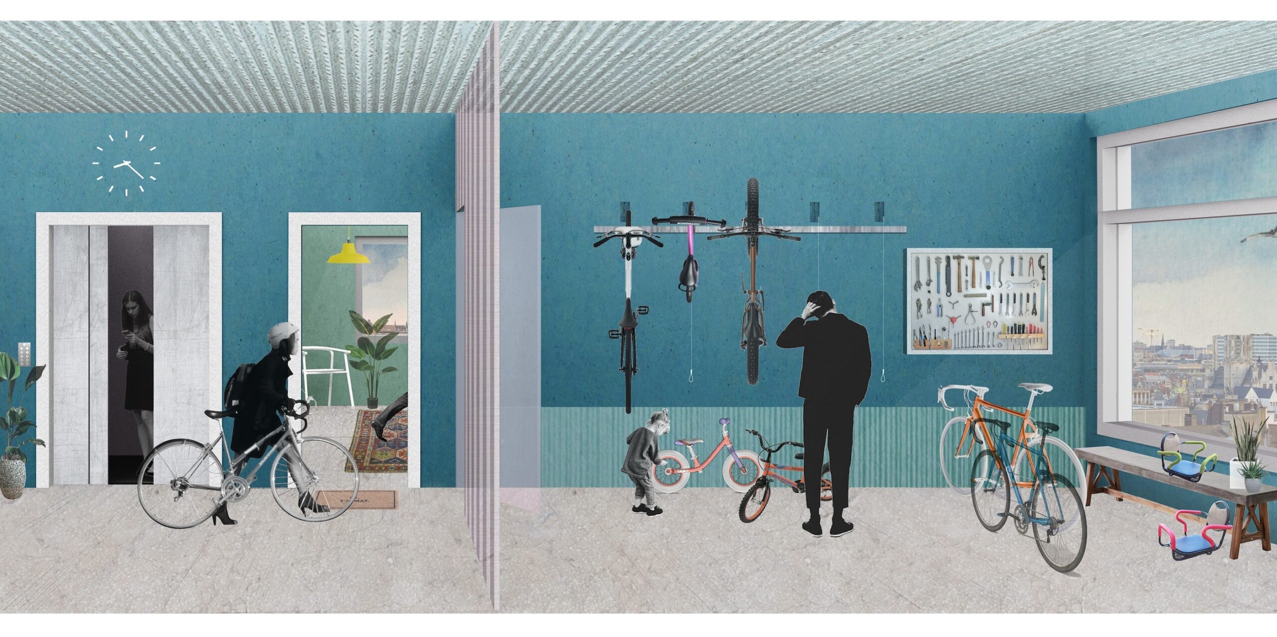 De spoortuin, Puurs Koer, trap, fietsenstalling: collectieve ruggengraat tussen straat en woning.Making A(nd) Living, Anderlecht Een trapoverloop wordt fietsatelier: collectiviteit als vanzelfsprekendheid.